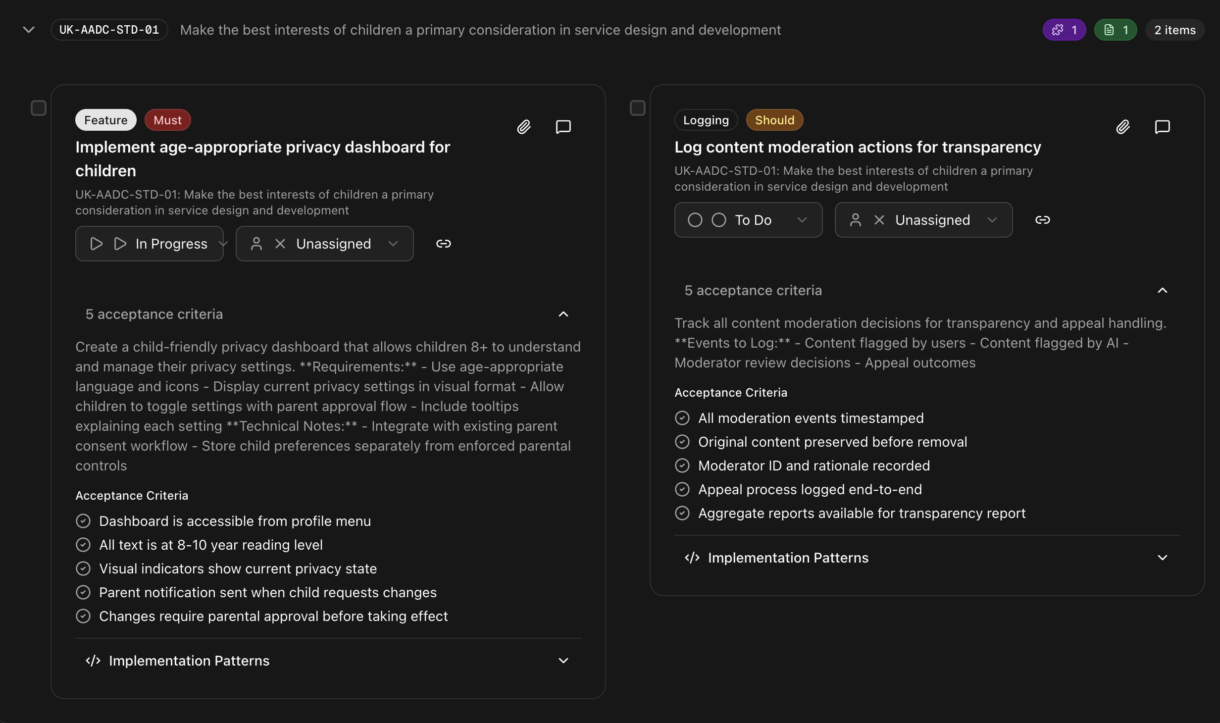Each applicable obligation produces prioritised work items with acceptance criteria, priority levels, and full traceability back to the source regulation.