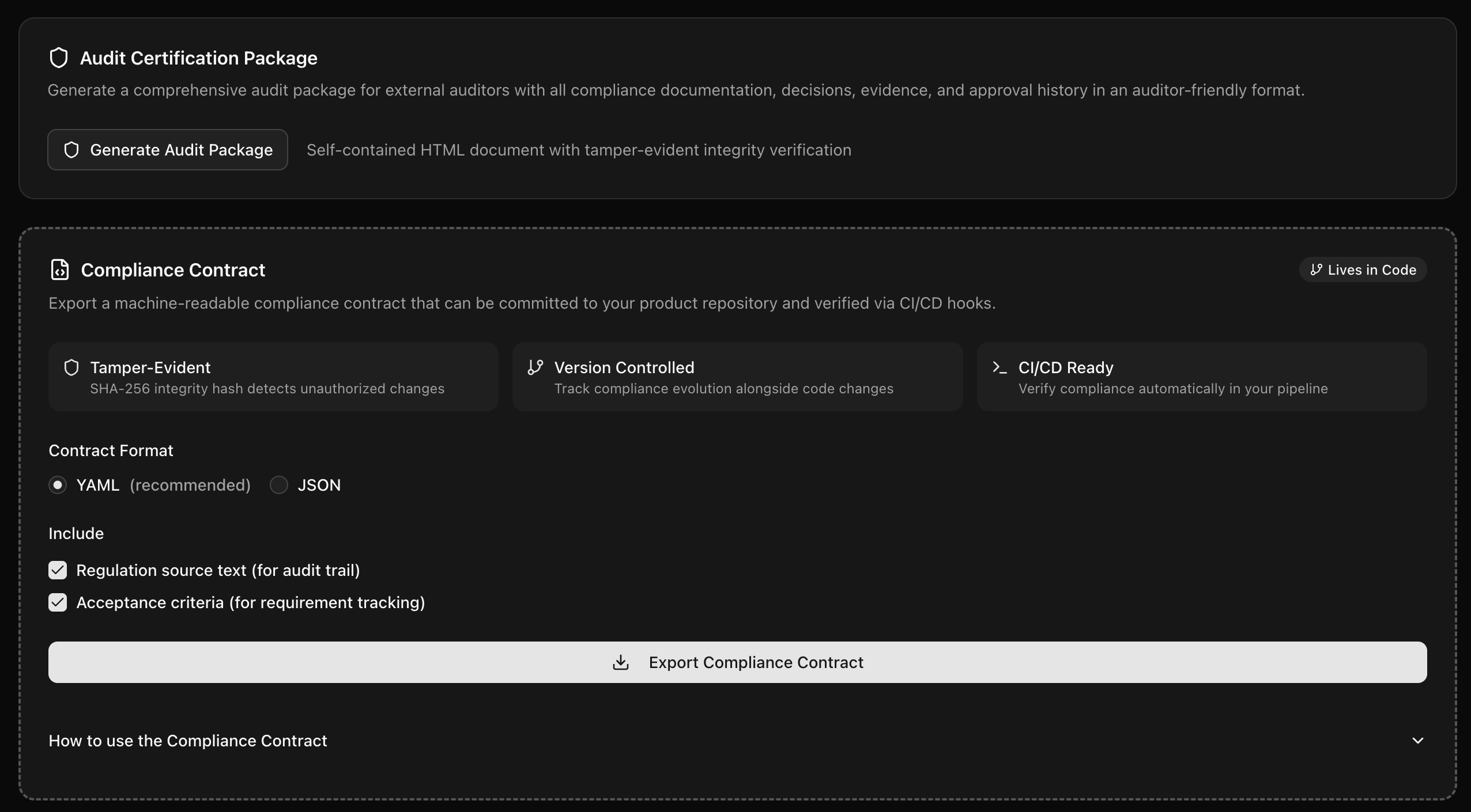 Generate comprehensive audit certification packages or machine-readable compliance contracts that live in your codebase and verify via CI/CD hooks.