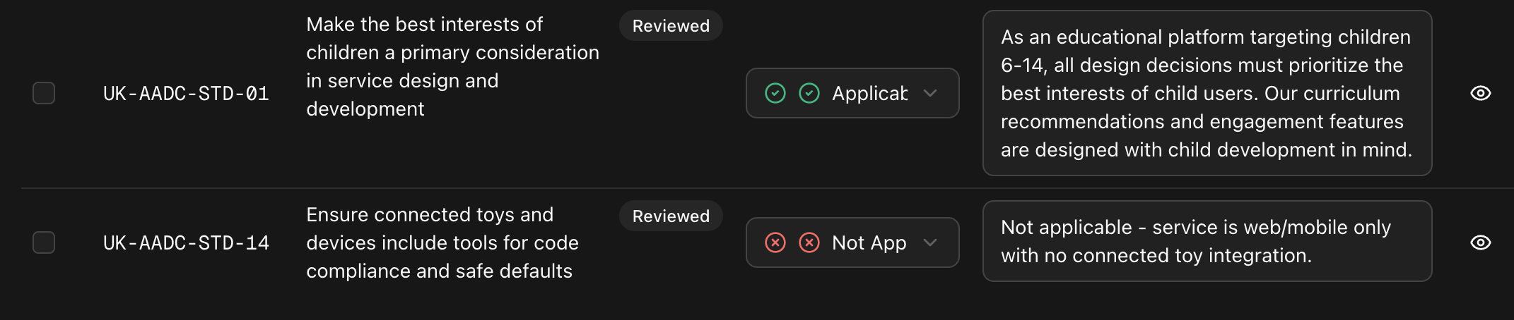 - Applicability status with reviewer badge